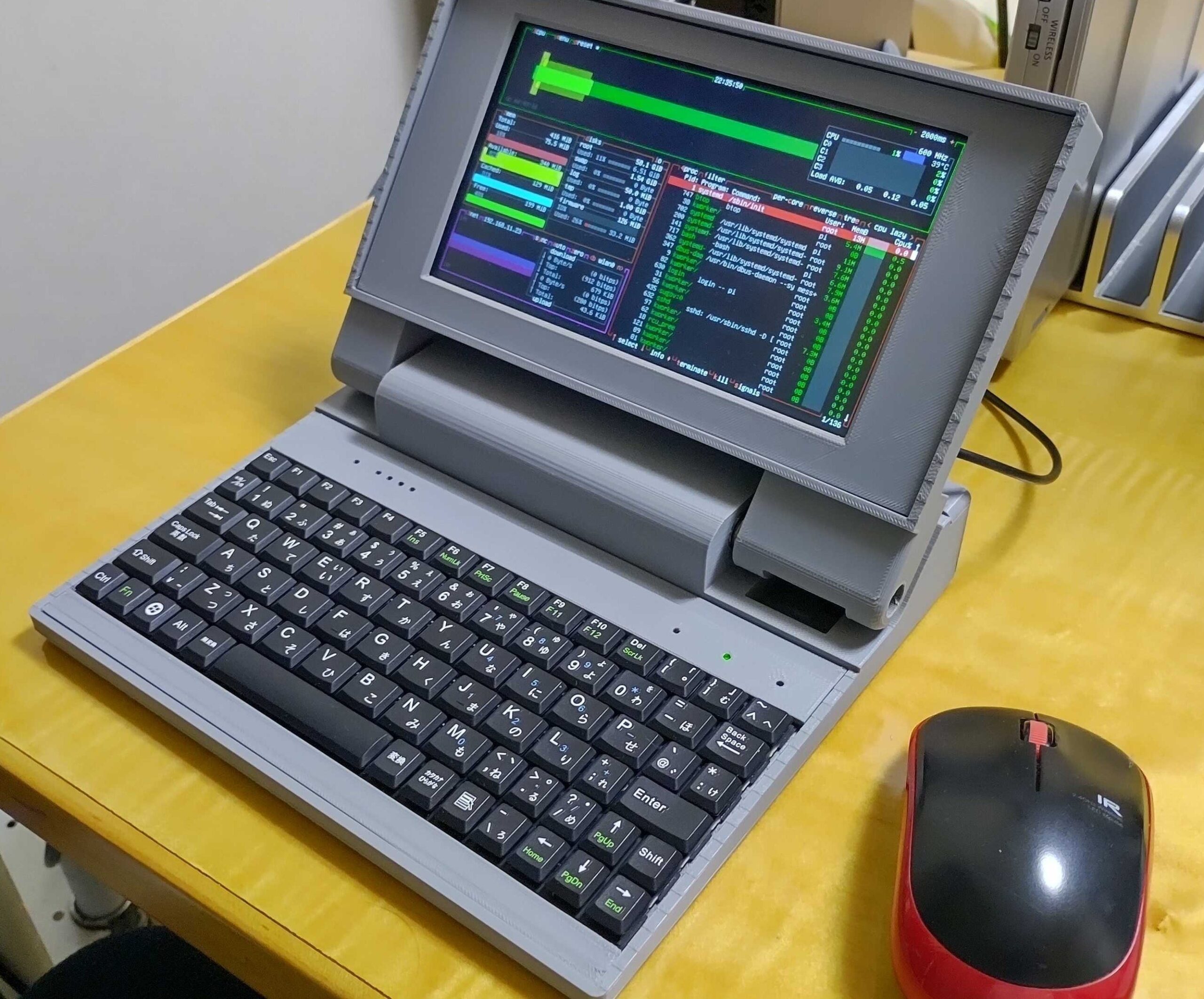 組み立て例。マウスと比較するとサイズ感がわかるかも。横214mm × 縦185mm × 38mm(クラムシェル閉じ状態、98NOTE(PC-9801NS/Tなど)の約70%)